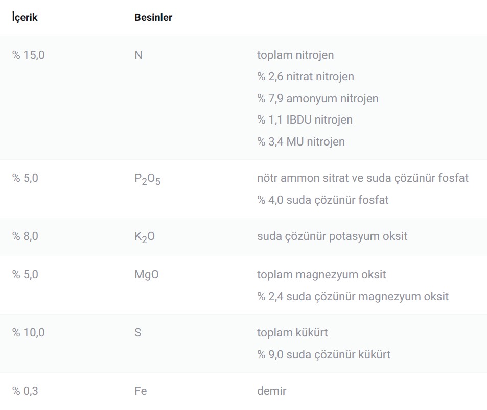 İzobutiliden diüre (IBDU) azot, formaldehit üre ve demir içeren magnezyum ve kükürt içeren NPK gübresi N-P2O5-K2O (+MgO+S) 15-5-8 (+5+10).