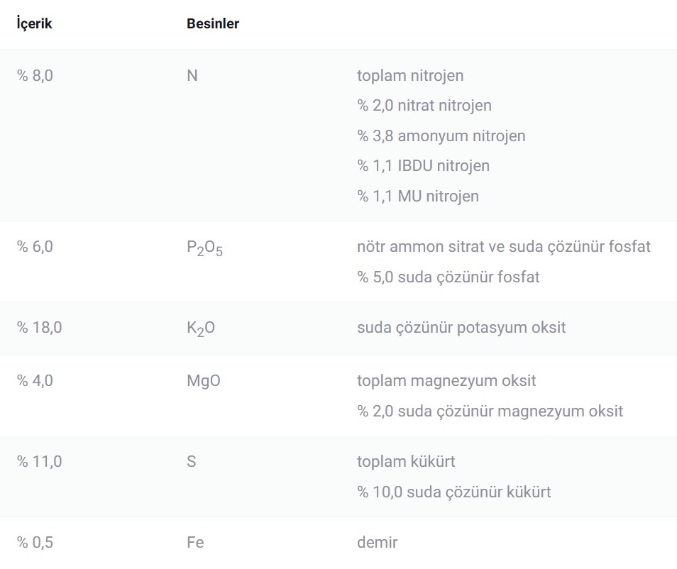 İzobutiliden diüre (IBDU) nitrojen, formaldehit üre ve bor, bakır, demir içeren kükürt N-P2O5-K2O(+MgO+S) 8-6-18(+4+11) içeren NPK gübresi, manganez ve demir.